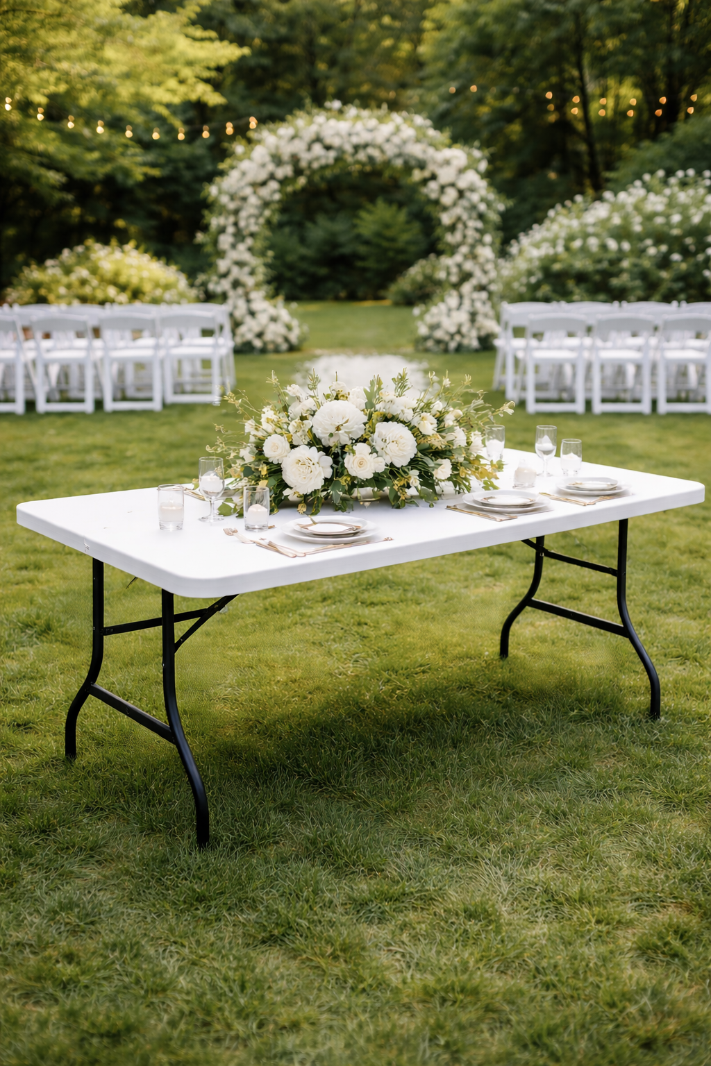 Clean, versatile, and effortlessly refined, our white folding table provides a polished foundation for elegant events. Its crisp white finish and sturdy design make it ideal for weddings, celebrations, and upscale gatherings.